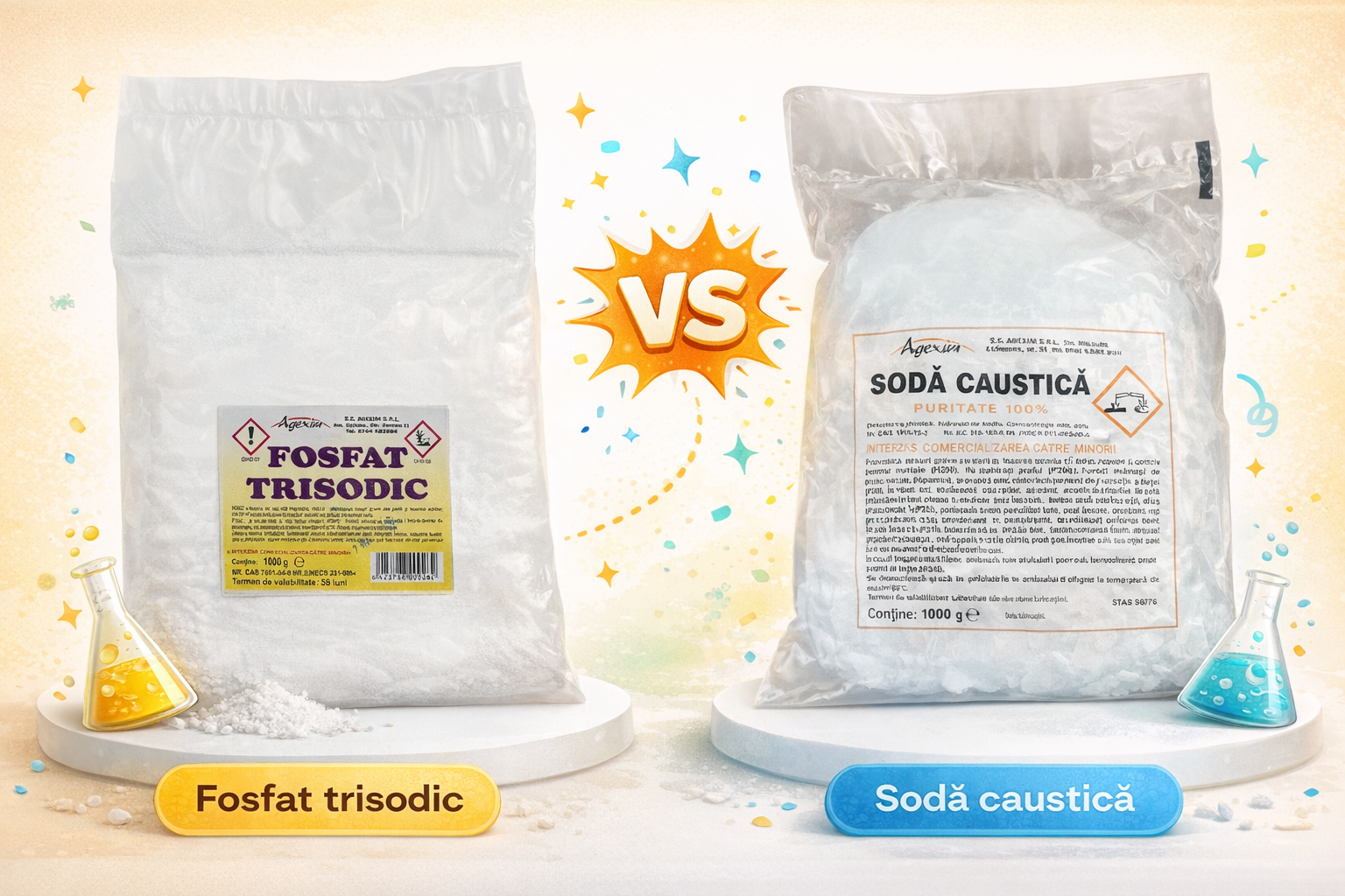 Diferența dintre fosfat trisodic și sodă caustică constă în nivelul de alcalinitate și tipul de utilizare. Fosfatul trisodic este utilizat în principal pentru degresare și pregătirea suprafețelor, oferind o acțiune eficientă dar controlată. Soda caustică este mai agresivă, având o alcalinitate mai ridicată și fiind utilizată frecvent pentru desfundarea țevilor și procese industriale.